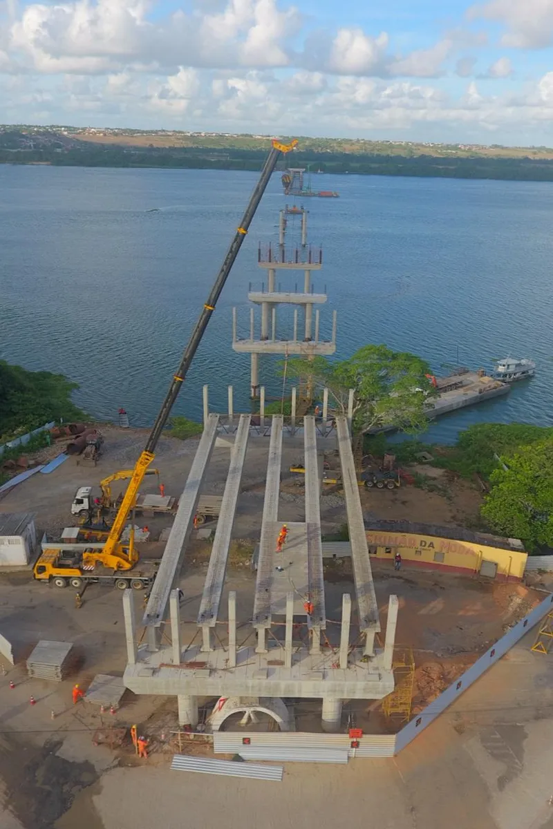Com 1.180 metros de extensão e 18 metros de largura, a ponte já começou a receber as vigas que sustentarão o tabuleiro. Das 120 previstas, cinco já foram instaladas. Cada peça tem mais de 35 metros de comprimento e pesa cerca de 80 toneladas. O projeto inclui ainda um vão central de 150 metros e altura de 30 metros no trecho navegável, permitindo a passagem de embarcações.