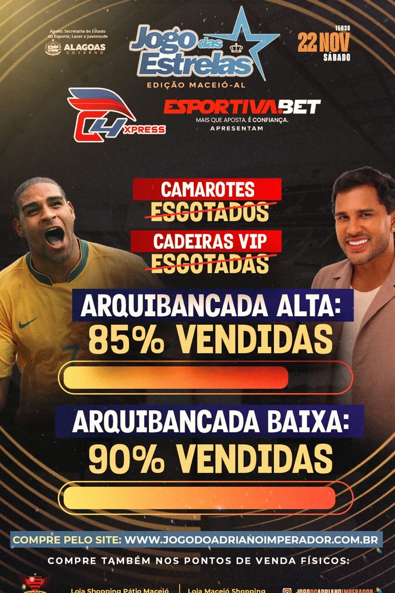 O Jogo das Estrelas será realizado no próximo sábado (22), no Estádio Rei Pelé, em Maceió, e os ingressos para o evento festivo, que terá Adriano Imperador em campo, entre outros craques, já estão praticamente esgotados como, por exemplo, para os setores dos camarotes e das cadeiras vips.