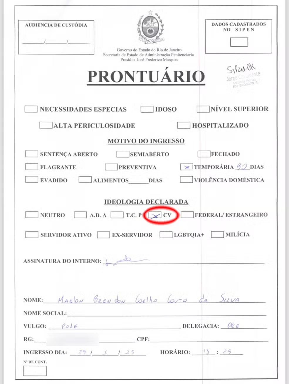 O g1 teve acesso ao prontuário do cantor. No item “ideologia declarada”, Poze tinha 9 opções: neutro; ADA; TCP; CV; milícia; federal ou estrangeiro; servidor ativo; ex-servidor; LGBTQIA+. O MC marcou a opção Comando Vermelho.