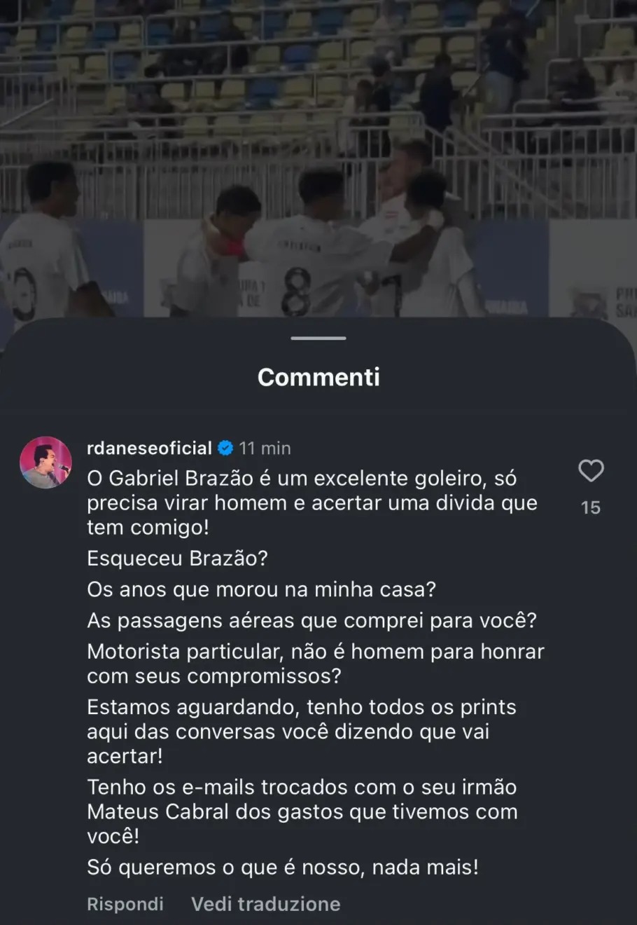 “O Gabriel Brazão é um excelente goleiro, só precisa virar homem e acertar uma dívida que tem comigo! ESQUECEU BRAZÃO? Os anos que morou na minha casa? As passagens aéreas que comprei para você? Motorista particular, não é homem para honrar com seus compromissos? Estamos aguardando, tenho todos os prints aqui das conversas você dizendo que vai acertar! Tenho os e-mails trocados com o seu irmão Mateus Cabral dos gastos que tivemos com você! Só queremos o que é nosso, nada mais!”, publicou o compositor de “Faz um milagre em mim”.
